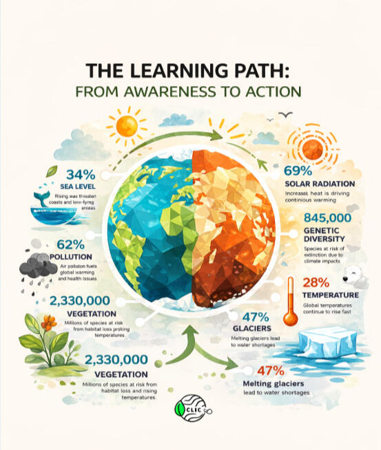 CLIC is an Erasmus+ co-funded project aimed at empowering young people to take action against climate change and become active citizens in their communities. Through training, creative activities, and international collaboration, CLIC wants to equip youth with the knowledge and tools to promote sustainability and influence environmental decision-making.For this reason, in the framework of this project we will create training materials to train young people on how to generate awareness on climate change and we will organize a transnational competition among young people from 4 different European countries: Spain, Italy, Romania, and Portugal.